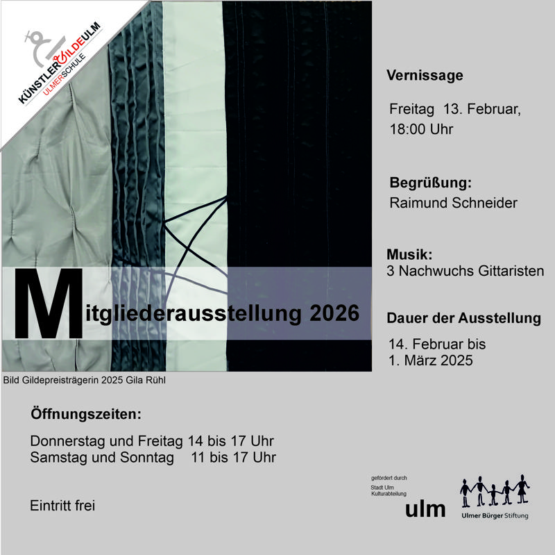 Mitgliederausstellung 2026 der Künstlergilde Ulm Vom 14.02.2026 – 01.03.2026 nehme ich mit 2 Arbeiten an der Mitgliederausstellung 2026 der Künstlergilde Ulm teil.Öffnungszeiten:Donnerstag und Freitag, 14:00 Uhr – 17:00 UhrSamstag und Sonntag: 11:00 Uhr – 17:00 UhrEintritt frei